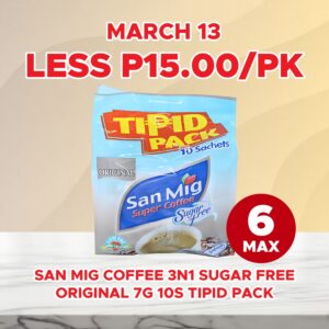 SAN MIG COFFEE 3N1 SUGAR FREE ORIGINAL 7G 10S TIPID PACK LESS P15.00/PK