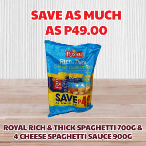 • Royal Rich & Thick Spaghetti 700g & 4 Cheese Spaghetti Sauce 900g Save as much as P49.00