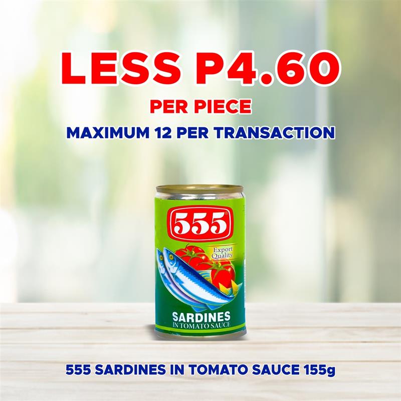 Sale! 555 SARDINES IN TOMATO SAUCE 155G LESS P4.60/PC You can purchase this product till 2025-10-30 ₱23.00 ₱18.40 64 in stock - 555 SARDINES IN TOMATO SAUCE 155G LESS P4.60/PC quantity + Add to cart SKU: S-748485200019 Categories: 1-DAY SALE, SAVE UP TO P62.00 Related products Sale! NISSIN EGGNOG COOKIES 18G 10S FREE LUCKY ME NOODLES BEEF 55G Available till 2025-10-30 ₱67.75 ₱62.00 Add to cart Sale! STAR MARGARINE SWEET BLEND 100G LESS P7.40/PC Available till 2025-10-30 ₱37.00 ₱29.60 Add to cart Sale! STAR MARGARINE CLASSIC 250G LESS P16.00/PC Available till 2025-10-30 ₱80.00 ₱64.00 Add to cart Sale! BIODERM SOAP BLOOM 60G LESS P3.10/PC Available till 2025-10-30 ₱15.50 ₱12.40 Add to cart