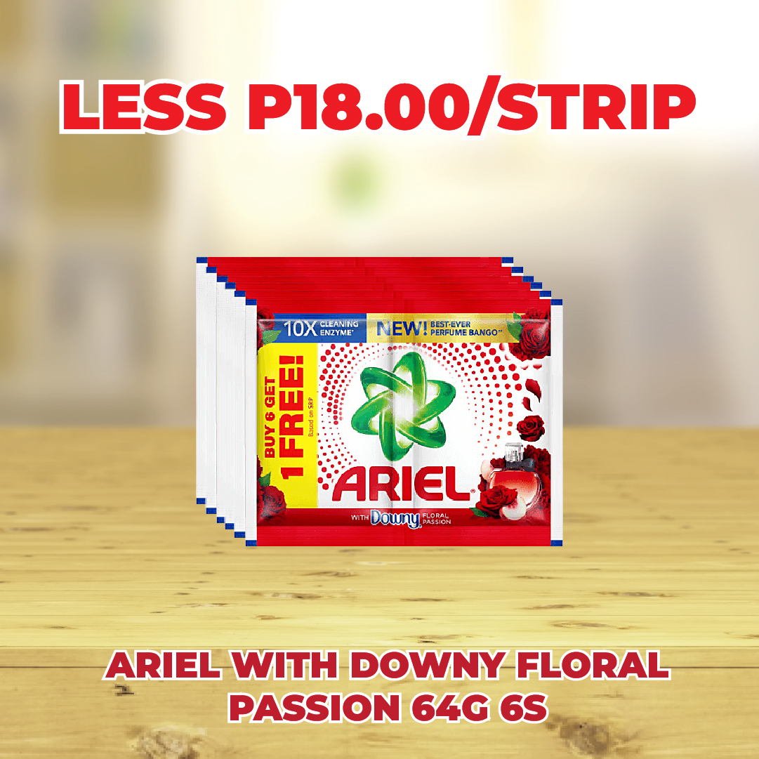 Sale! ARIEL WITH DOWNY FLORAL PASSION POWDER 64G 6S LESS P18.00/STRIP This product will be available on 2026-04-30 ₱90.00 ₱72.00 SKU: S-4902430583183 Categories: 1-DAY SALE, SAVE UP TO P72.00 Related products Sale! SAFEGUARD WHITE 65G LESS P4.20/PC Available on 2026-04-30 ₱21.00 ₱16.80 Read more Sale! SURF POWDER ACTIVE CLEAN BLOSSOM FRESH 74G 6S LESS P9.75/STRIP Available on 2026-04-30 ₱48.60 ₱38.85 Read more Sale! SAFEGUARD PURE WHITE 115G 3S LESS P42.00/PC Available on 2026-04-30 ₱141.00 ₱99.00 Read more Sale! ARGENTINA BEEF LOAF 170GLESS P5.00/PC Available on 2026-04-30 ₱25.00 ₱20.00 Read more