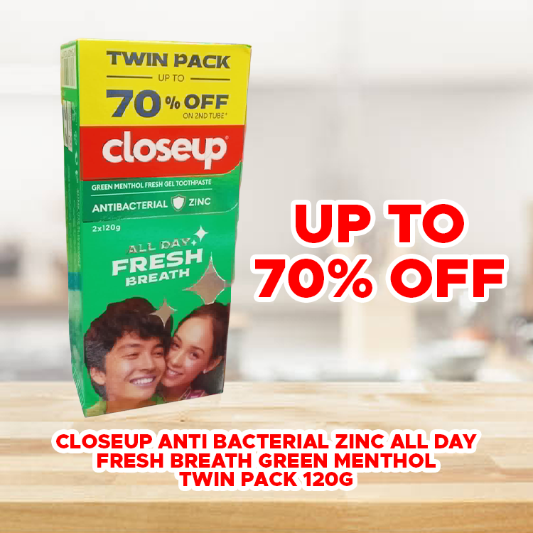 Closeup Anti Bacterial Zinc All Day Fresh Breath Green Menthol Twin Pack 120g Up to 70% Off₱128.00 20 in stock - Closeup Anti Bacterial Zinc All Day Fresh Breath Green Menthol Twin Pack 120g Up to 70% Off quantity + Add to cart SKU: 8934839125677 Category: Value Plus Related products Mang Tipid Antibac 500ml 2 for P69.00 ₱69.00 Add to cart Mang Tipid Antibac 1000ml 2 for P99.00 ₱99.00 Add to cart Tide Perfect Clean Original 69g 6+1 ₱88.00 Add to cart Mang Tipid Antibac 850ml 2 for P89.00 ₱89.00 Add to cart