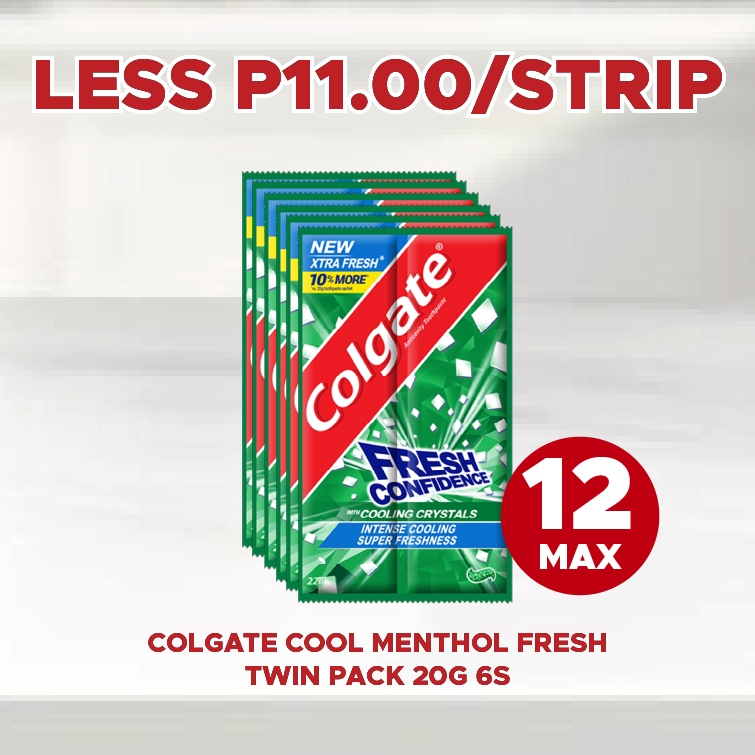 Sale! COLGATE COOL MENTHOL FRESH TWIN PACK 20G 6S LESS P11.00/STRIP This product will be available on 2026-04-30 ₱54.00 ₱43.00 SKU: S-8850006325230 Categories: 1-DAY SALE, SAVE UP TO P72.00 Related products Sale! SMART DISHWASHING PASTE KALAMANSI 200G LESS P4.60/PC Available on 2026-04-30 ₱23.00 ₱18.40 Read more Sale! ARIEL SUNRISE FRESH POWDER 66G 6S LESS P18.00/STRIP Available on 2026-04-30 ₱90.00 ₱72.00 Read more Sale! SAFEGUARD WHITE 65G LESS P4.20/PC Available on 2026-04-30 ₱21.00 ₱16.80 Read more Sale! ARIEL WITH DOWNY FLORAL PASSION POWDER 64G 6S LESS P18.00/STRIP Available on 2026-04-30 ₱90.00 ₱72.00 Read more