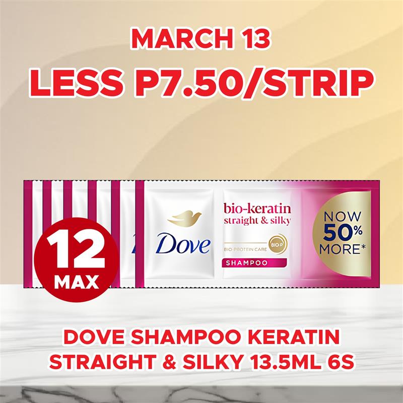 Sale! DOVE SHAMPOO KERATIN STRAIGHT & SILKY 13.5ML 6S LESS P7.50/STRIP You can purchase this product till 2026-03-13 ₱36.00 ₱28.50 94 in stock - DOVE SHAMPOO KERATIN STRAIGHT & SILKY 13.5ML 6S LESS P7.50/STRIP quantity + Add to cart SKU: S-4800888212917 Categories: 2-DAY SALE, SAVE UP TO P283.00 Related products Sale! SELECTA SUPRME COOKIES & CREAM 1.25L SELECTA 3IN1 UBE MANGO AVOCADO 750ML (1:1) P95.00 Available till 2026-03-13 ₱350.00 ₱255.00 Add to cart Sale! DOVE SHAMPOO RESTORATIVE OIL NOURISHING CARE 12ML 6S LESS P6.75/STRIP Available till 2026-03-13 ₱33.00 ₱26.25 Add to cart Sale! SILKA WHITENING SOAP SHEA BUTTER 65G LESS P4.60/PC Available till 2026-03-13 ₱23.00 ₱18.40 Add to cart Sale! ORCHID DEODORIZER REFILL SAMPAGUITA 50G LESS P7.00/PC Available till 2026-03-13 ₱35.00 ₱28.00 Add to cart
