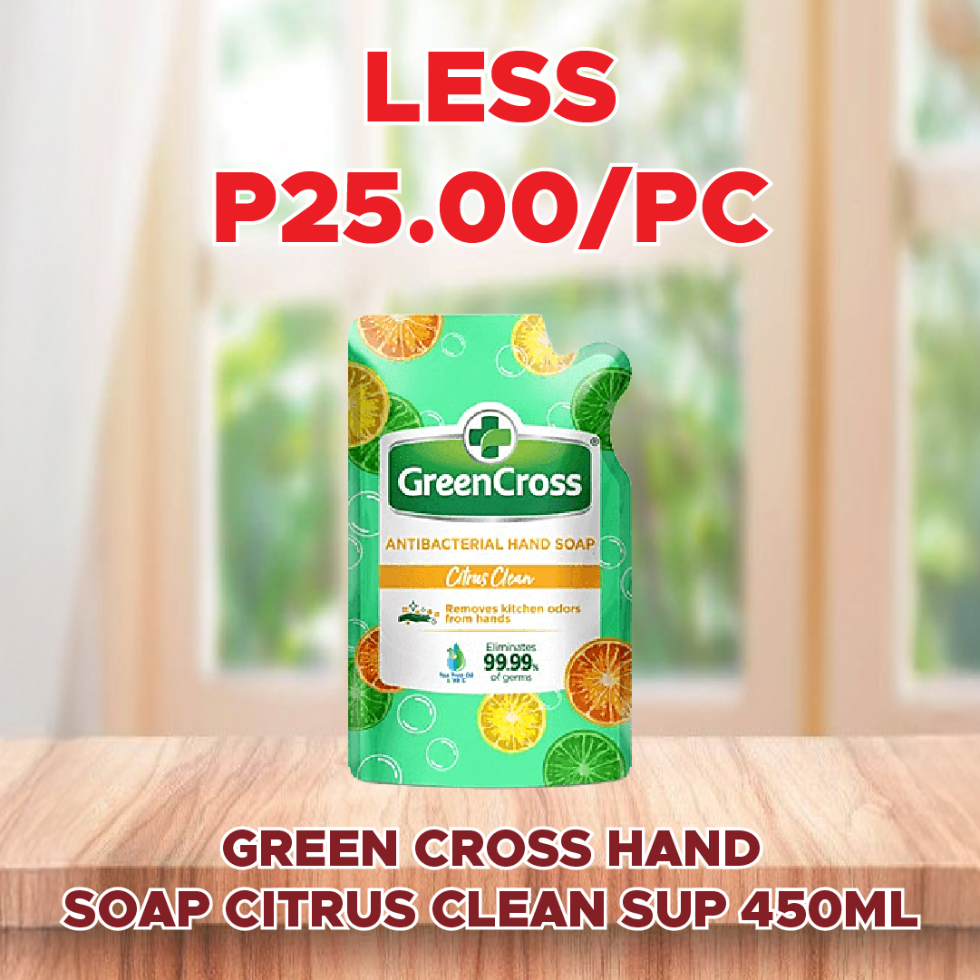Sale! GREEN CROSS HAND SOAP CITRUS CLEAN SUP 450ML LESS P25.00/PC This product will be available on 2025-10-30 ₱102.00 ₱77.00 SKU: S-4800047866005 Categories: 1-DAY SALE, SAVE UP TO P62.00 Related products Sale! NISSIN EGGNOG COOKIES 18G 10S FREE LUCKY ME NOODLES BEEF 55G Available on 2025-10-30 ₱67.75 ₱62.00 Read more Sale! LUCKY ME PANCIT CANTON KALAMANSI KASALO PACK 120G 3+1 Available on 2025-10-30 ₱74.00 ₱55.50 Read more Sale! 555 SARDINES IN TOMATO SAUCE 155G LESS P4.60/PC Available on 2025-10-30 ₱23.00 ₱18.40 Read more Sale! MAGNOLIA CHICKEN SPREAD 220ML LESS P18.40/PC Available on 2025-10-30 ₱92.00 ₱73.60 Read more