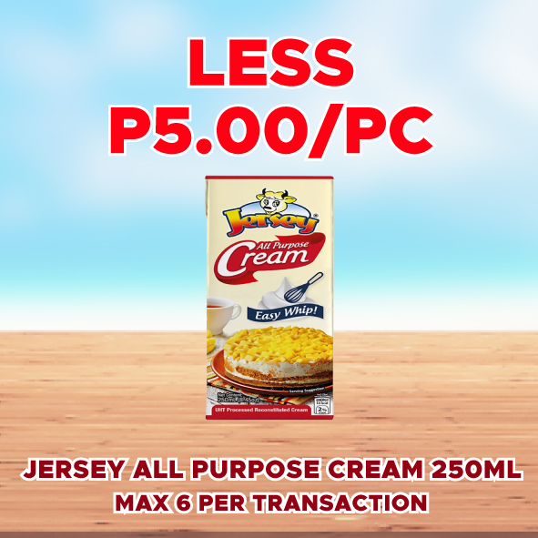 Sale! JERSEY ALL PURPOSE CREAM 250ML LESS P5.00/PC This product will be available on 2026-04-30 ₱47.50 ₱42.50 SKU: S-4806516763639 Categories: 1-DAY SALE, SAVE UP TO P72.00 Related products Sale! SMART DISHWASHING PASTE KALAMANSI 200G LESS P4.60/PC Available on 2026-04-30 ₱23.00 ₱18.40 Read more Sale! PANTENE CONDITIONER BIOTIN HAIR FALL CONTROL 150ML LESS P50.00/PC Available on 2026-04-30 ₱166.00 ₱116.00 Read more Sale! ARIEL WITH DOWNY FLORAL PASSION POWDER 64G 6S LESS P18.00/STRIP Available on 2026-04-30 ₱90.00 ₱72.00 Read more Sale! CREAM SILK KERATIN DAMAGE REPAIR 18ML 6S LESS P8.40/STRIP Available on 2026-04-30 ₱42.00 ₱33.60 Read more