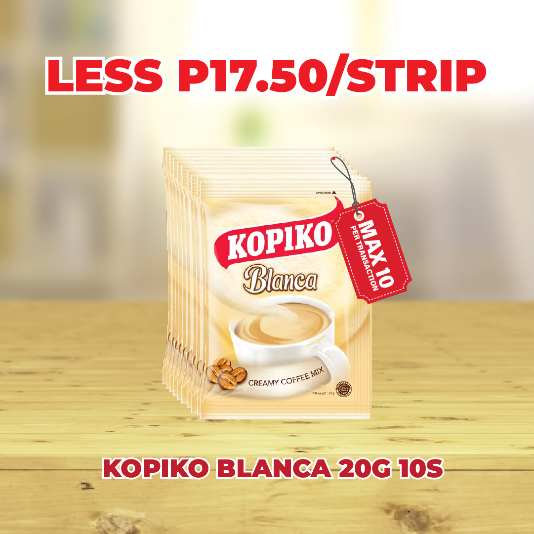 Sale! KOPIKO BLANCA 20G 10S LESS P17.50/STRIP This product will be available on 2026-04-30 ₱87.50 ₱70.00 SKU: S-8996001414309 Categories: 1-DAY SALE, SAVE UP TO P72.00 Related products Sale! SAFEGUARD WHITE 65G LESS P4.20/PC Available on 2026-04-30 ₱21.00 ₱16.80 Read more Sale! HEAD & SHOULDER SHAMPOO COOL MENTHOL 12ML 6S LESS P8.90/STRIP Available on 2026-04-30 ₱44.40 ₱35.50 Read more Sale! SURF BAR ACTIVE CLEAN KALAMANSI 360G LESS P4.50/PC Available on 2026-04-30 ₱22.50 ₱18.00 Read more Sale! ARIEL LIQUID WITH DOWNY FLORAL PASSION 54G 6S LESS P18.00/STRIP Available on 2026-04-30 ₱90.00 ₱72.00 Read more