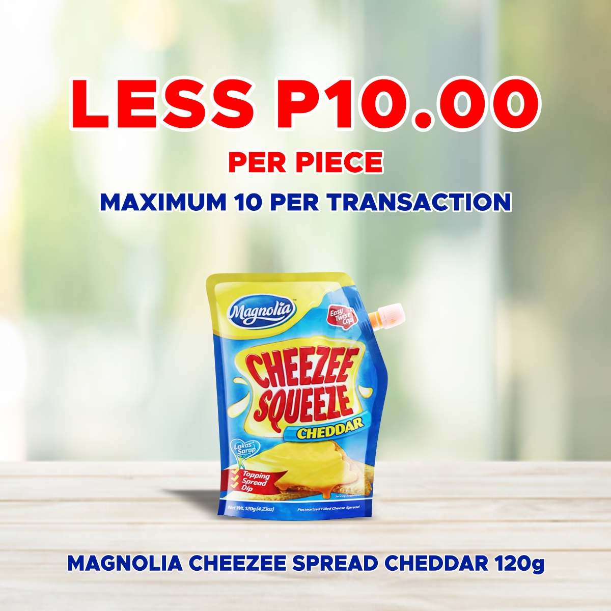 Sale! MAGNOLIA CHEEZEE SPREAD CHEDDAR 120G LESS P10.00/PC You can purchase this product till 2025-10-30 ₱49.00 ₱39.00 18 in stock - MAGNOLIA CHEEZEE SPREAD CHEDDAR 120G LESS P10.00/PC quantity + Add to cart SKU: S-4805358324022 Categories: 1-DAY SALE, SAVE UP TO P62.00 Related products Sale! MAGNOLIA SANDWICH SPREAD 220ML LESS P15.00/PC Available till 2025-10-30 ₱74.00 ₱59.00 Add to cart Sale! MAGNOLIA CHEEZEE PLAIN 430G LESS P27.00/PC Available till 2025-10-30 ₱135.00 ₱108.00 Add to cart Sale! NISSIN BINGO DOUBLE-CHOCO 28G 10S FREE LUCKY ME NOODLES BEEF 55G Available till 2025-10-30 ₱68.75 ₱60.00 Add to cart Sale! NISSIN BINGO ORANGE 28G 10S FREE LUCKY ME NOODLES CHICKEN 55G Available till 2025-10-30 ₱68.75 ₱60.00 Add to cart