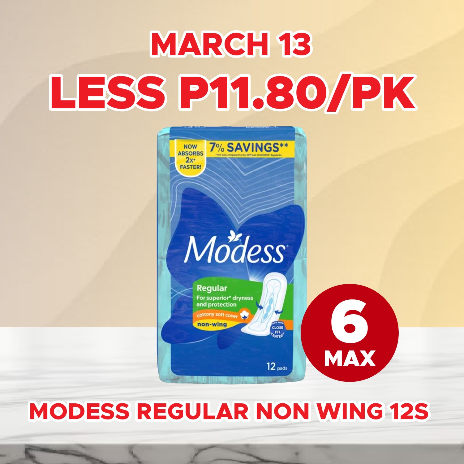Sale! MODESS REGULAR NON WING 12S LESS P11.80/PK You can purchase this product till 2026-03-13 ₱59.00 ₱47.20 18 in stock - MODESS REGULAR NON WING 12S LESS P11.80/PK quantity + Add to cart SKU: S-8850007371441 Categories: 2-DAY SALE, SAVE UP TO P283.00 Related products Sale! CREAMSILK ULTIMATE REBORN STRAIGHT 13ML 6S LESS P8.50/STRIP Available till 2026-03-13 ₱42.00 ₱33.50 Add to cart Sale! SILKA PAPAYA SOAP 65G LESS P3.55/PC Available till 2026-03-13 ₱17.75 ₱14.20 Add to cart Sale! NURTURE BABY WIPES POWDER SCENT 30S LESS P10.00/PC Available till 2026-03-13 ₱47.00 ₱37.00 Add to cart Sale! DOVE SHAMPOO KERATIN STRAIGHT & SILKY 13.5ML 6S LESS P7.50/STRIP Available till 2026-03-13 ₱36.00 ₱28.50 Add to cart