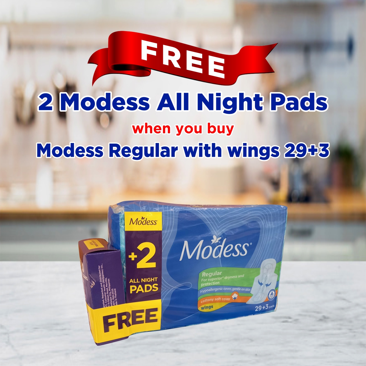 Modess Regular with wings 29+3 Free 2 Modess All Night Pads₱154.00 9 in stock - Modess Regular with wings 29+3 Free 2 Modess All Night Pads quantity + Add to cart SKU: 4801010342830 Category: Value Plus Related products Tender Love Cleansing Papaya Wipes 80s Buy 3 Take 1 Free ₱126.00 Add to cart Palmolive Naturals Silky Straight Olive Oil & Keratin 180ml Get 2nd Bottle at 50% off ₱186.00 Add to cart Ambi Pur Room Fresh Romantic Rose 180g Buy 2 Save up to P59.00 ₱264.00 Add to cart Mang Tipid Antibac 1000ml 2 for P99.00 ₱99.00 Add to cart