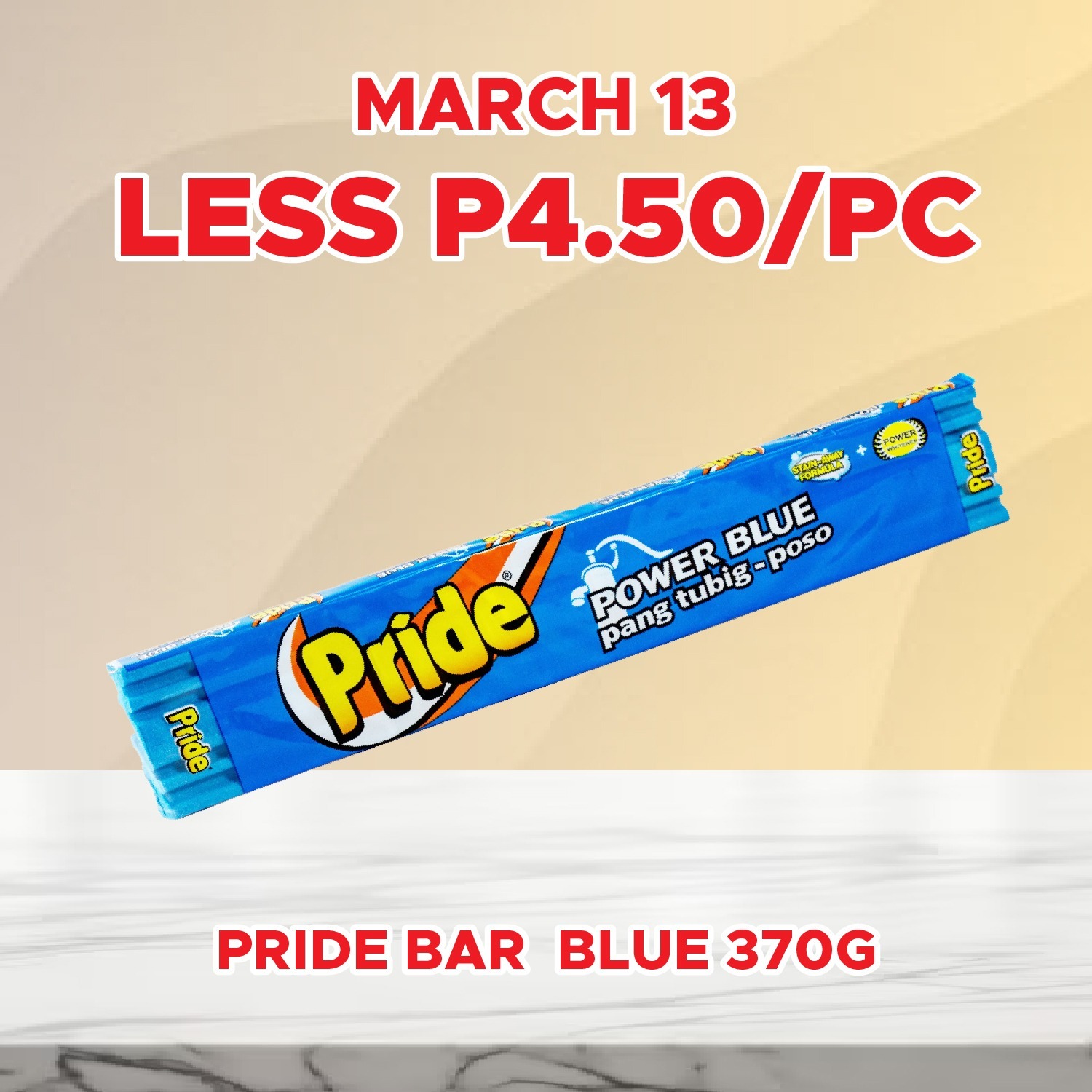 Sale! PRIDE BAR BLUE 370G LESS P4.50/PC You can purchase this product till 2026-03-13 ₱22.00 ₱17.50 65 in stock - PRIDE BAR BLUE 370G LESS P4.50/PC quantity + Add to cart SKU: S-4800045330072 Categories: 2-DAY SALE, SAVE UP TO P283.00 Related products Sale! DOVE SHAMPOO RESTORATIVE OIL NOURISHING CARE 12ML 6S LESS P6.75/STRIP Available till 2026-03-13 ₱33.00 ₱26.25 Add to cart Sale! SEASONS FRUIT MIX 3.03KG LESS 50% Available till 2026-03-13 ₱317.00 ₱158.50 Add to cart Sale! PALMOLIVE SHAMPOO SILKY STRAIGHT 15ML 6S LESS P8.50/STRIP Available till 2026-03-13 ₱40.50 ₱32.00 Add to cart Sale! SURF BAR ACTIVE CLEAN CHERRY BLOSSOM 120G LESS P2.50/PC Available till 2026-03-13 ₱11.50 ₱9.00 Add to cart