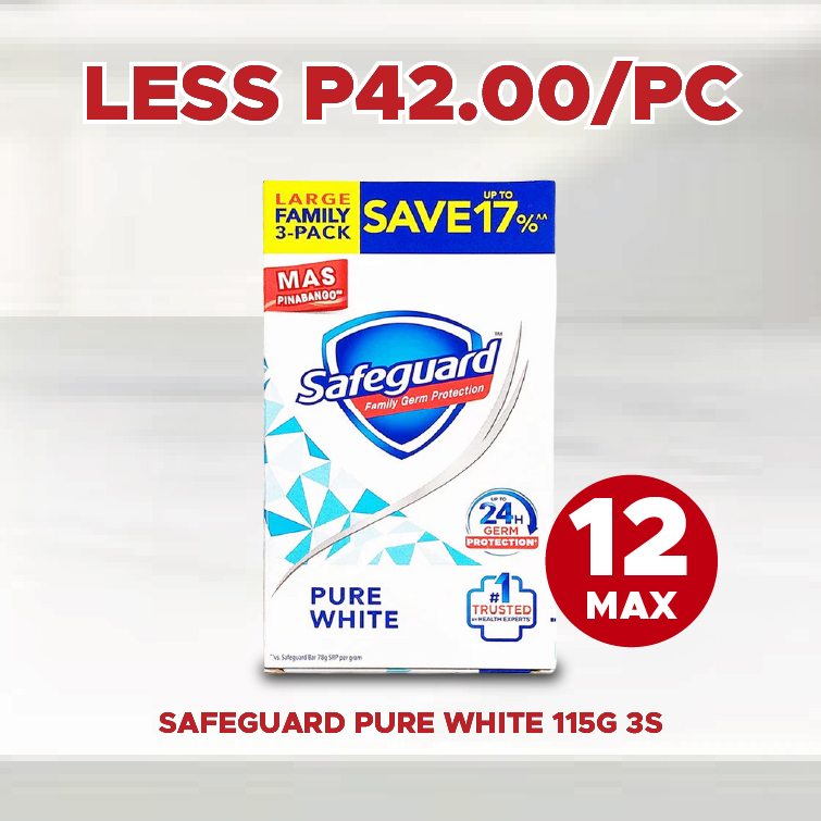 Sale! SAFEGUARD PURE WHITE 115G 3S LESS P42.00/PC This product will be available on 2026-04-30 ₱141.00 ₱99.00 SKU: S-411094 Categories: 1-DAY SALE, SAVE UP TO P72.00 Related products Sale! SURF POWDER ACTIVE CLEAN SUN FRESH 65G 6S LESS P8.10/STRIP Available on 2026-04-30 ₱40.50 ₱32.40 Read more Sale! SHIELD BATH SOAP PINK 55G LESS P3.00/PC Available on 2026-04-30 ₱14.00 ₱11.00 Read more Sale! SURF BAR ACTIVE CLEAN BLOSSOM FRESH 360G LESS P5.70/PC Available on 2026-04-30 ₱28.50 ₱22.80 Read more Sale! SAFEGUARD WHITE 65G LESS P4.20/PC Available on 2026-04-30 ₱21.00 ₱16.80 Read more