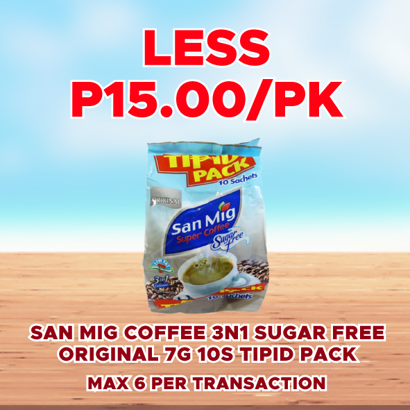 Sale! SAN MIG COFFEE 3N1 SUGAR FREE ORIGINAL 7G 10S TIPID PACK LESS P15.00/PK This product will be available on 2026-04-30 ₱75.00 ₱60.00 SKU: S-4806513741715 Categories: 1-DAY SALE, SAVE UP TO P72.00 Related products Sale! PRIDE KOREAN STRAWBERRY BLOOM POWDER 40G 6S LESS P5.40/STRIP Available on 2026-04-30 ₱27.00 ₱21.60 Read more Sale! ARIEL WITH DOWNY FLORAL PASSION POWDER 64G 6S LESS P18.00/STRIP Available on 2026-04-30 ₱90.00 ₱72.00 Read more Sale! SMART DISHWASHING PASTE LEMON 200GLESS P4.60/PC Available on 2026-04-30 ₱23.00 ₱18.40 Read more Sale! SURF BAR ACTIVE CLEAN CHERRY BLOSSOM 360G LESS P5.70/PC Available on 2026-04-30 ₱28.50 ₱22.80 Read more