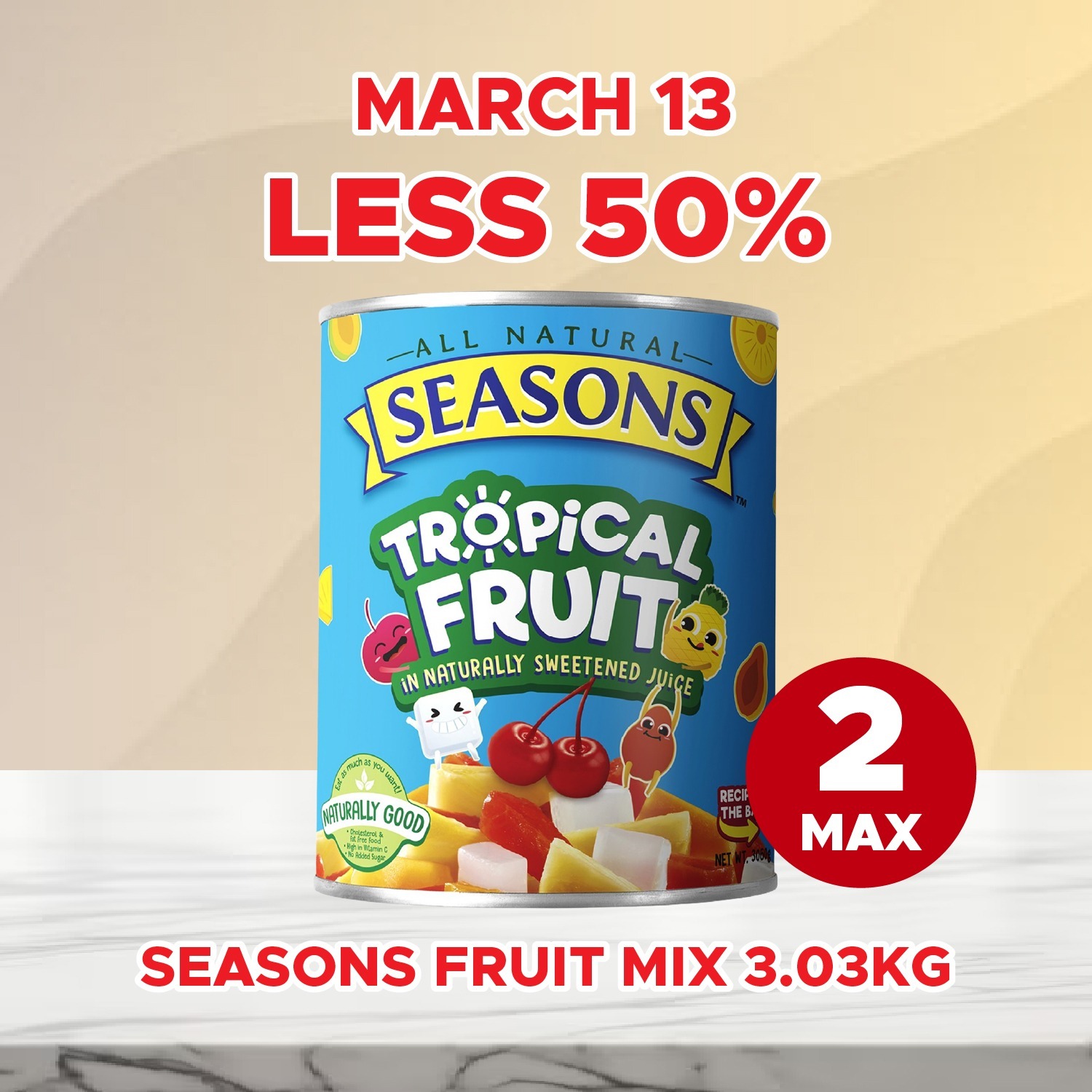 Sale! SEASONS FRUIT MIX 3.03KG LESS 50% You can purchase this product till 2026-03-13 ₱317.00 ₱158.50 5 in stock - SEASONS FRUIT MIX 3.03KG LESS 50% quantity + Add to cart SKU: S-380496 Categories: 2-DAY SALE, SAVE UP TO 50% Related products Sale! PRIDE BAR FRESH CAMELLIA 370G LESS P4.50/PC Available till 2026-03-13 ₱22.00 ₱17.50 Add to cart Sale! SELECTA SUPREME DOUBLE DUTCH 1.25L SELECTA 3IN1 UBE MANGO AVOCADO 750ML (1:1) P95.00 Available till 2026-03-13 ₱350.00 ₱255.00 Add to cart Sale! PH CARE NATURAL PROTECTION 50ML LESS 50% Available till 2026-03-13 ₱54.00 ₱27.00 Add to cart Sale! CREAMSILK ULTIMATE REBORN STRAIGHT 13ML 6S LESS P8.50/STRIP Available till 2026-03-13 ₱42.00 ₱33.50 Add to cart