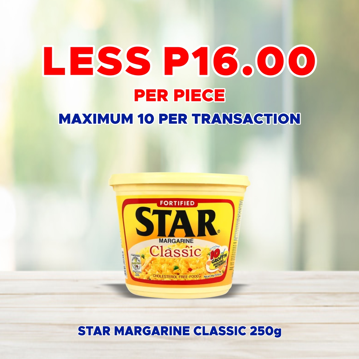Sale! STAR MARGARINE CLASSIC 250G LESS P16.00/PC You can purchase this product till 2025-10-30 ₱80.00 ₱64.00 61 in stock - STAR MARGARINE CLASSIC 250G LESS P16.00/PC quantity + Add to cart SKU: S-4805358245051 Categories: 1-DAY SALE, SAVE UP TO P62.00 Related products Sale! BIODERM SOAP COOLNESS 60G LESS P3.30/PC Available till 2025-10-30 ₱16.50 ₱13.20 Add to cart Sale! 555 HOT SARDINES IN TOMATO SAUCE 155G LESS P4.65/PC Available till 2025-10-30 ₱23.25 ₱18.60 Add to cart Sale! COCO MAMA FRESH GATA 200ML LESS P6.70/PC Available till 2025-10-30 ₱33.50 ₱26.80 Add to cart Sale! LUCKY ME GO CUP JJAMPPONG 40G 3+1 Available till 2025-10-30 ₱102.00 ₱76.50 Add to cart