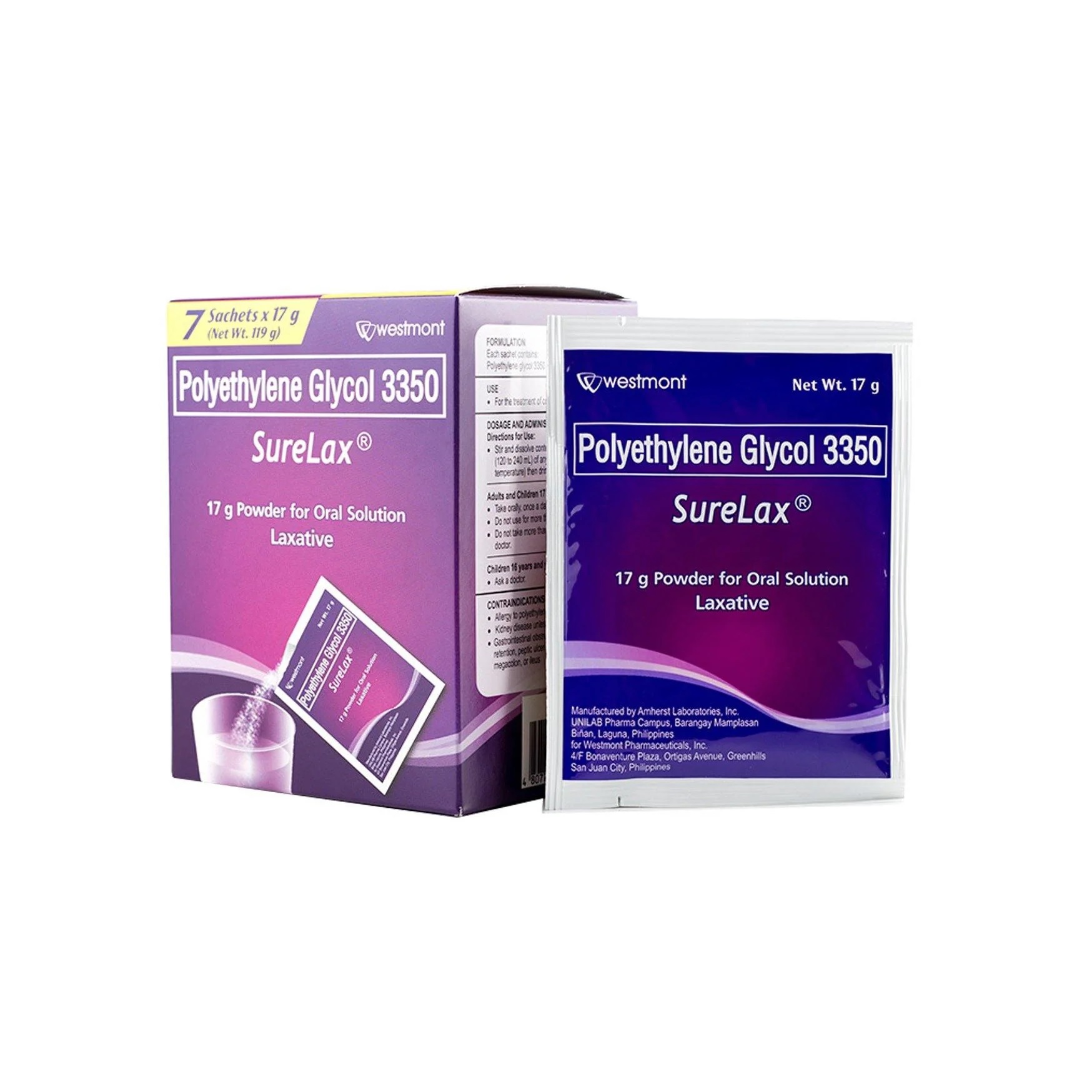 SURELAX 17G POWDER SACHET 7’S₱60.25 Polyethylene Glycol 3350 Laxative Sold per sachet 30 in stock - SURELAX 17G POWDER SACHET 7'S quantity + Add to cart Category: Medicine Corner Additional information Additional information MCBarcode 00000000006112 Related products TAI CHI GINGER RUB 10G ₱42.00 Read more SENSEDOL CAPSULES ₱18.00 Add to cart SOVIT-CEE CAPSULES ₱6.00 Add to cart OMX PROBIOTIC CAPSULES ₱57.75 Add to cart