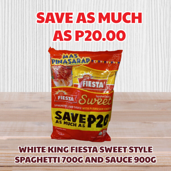 White King Fiesta Sweet Style Spaghetti 700g and Sauce 900g Save as much as P20.00₱128.50 5 in stock - White King Fiesta Sweet Style Spaghetti 700g and Sauce 900g Save as much as P20.00 quantity + Add to cart SKU: 4800110069227 Category: Value Plus Related products Safeguard Bar Soap Arctic Fresh 60g Buy 6 Get 1 Free ₱118.40 Add to cart Mang Tipid Antibac 850ml 2 for P89.00 ₱89.00 Add to cart Mang Tipid Kalamansi 1000ml2 for P99.00 ₱99.00 Read more Bubble Man Kalamansi 880ml 2 for P149.00 ₱149.00 Read more