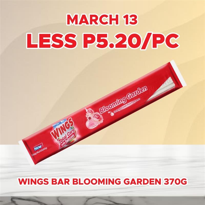 Sale! WINGS BAR BLOOMING GARDEN 370G LESS P5.20/PC You can purchase this product till 2026-03-13 ₱26.00 ₱20.80 71 in stock - WINGS BAR BLOOMING GARDEN 370G LESS P5.20/PC quantity + Add to cart SKU: S-8998866802659 Categories: 2-DAY SALE, SAVE UP TO P283.00 Related products Sale! PALMOLIVE SHAMPOO INTENSIVE MOISTURE 15ML 6S LESS P8.50/STRIP Available till 2026-03-13 ₱40.50 ₱32.00 Add to cart Sale! SEASONS FRUIT MIX 3.03KG LESS 50% Available till 2026-03-13 ₱317.00 ₱158.50 Add to cart Sale! CREAMSILK ULTIMATE REBORN STRAIGHT 13ML 6S LESS P8.50/STRIP Available till 2026-03-13 ₱42.00 ₱33.50 Add to cart Sale! ORCHID DEODORIZER REFILL CHERRY 50G LESS P7.00/PC Available till 2026-03-13 ₱35.00 ₱28.00 Add to cart